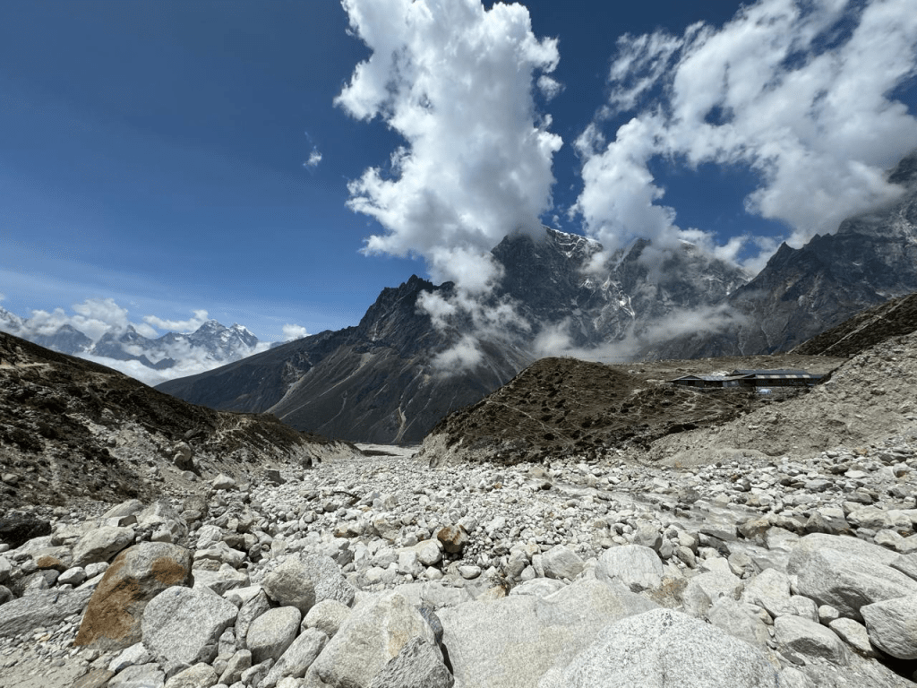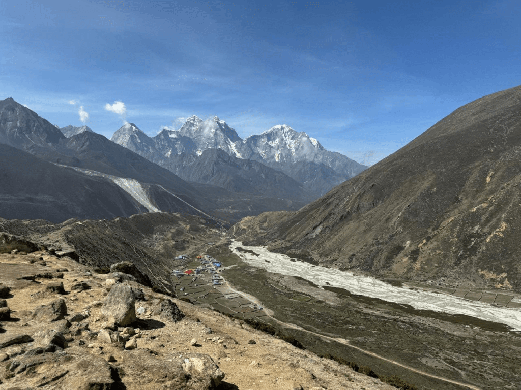 We walked along a river gorge, with the mountains rising steeply on one side and the rushing river far below us on the other. The wind had picked up again, biting at our faces, but the warmth of the Sun kept us going. We stopped frequently to take photos, capturing the breathtaking views that surrounded us. Every angle offered a new perspective, a new appreciation for the sheer scale of the mountains that now felt like old friends. As we neared Lobuche, the terrain became even more barren. The trail was dry and dusty, and the air was thin and cold. The towns were becoming fewer and farther between, and the amenities were growing more basic. It was clear that we were now entering a different phase of the trek – one that required even greater resilience and determination.