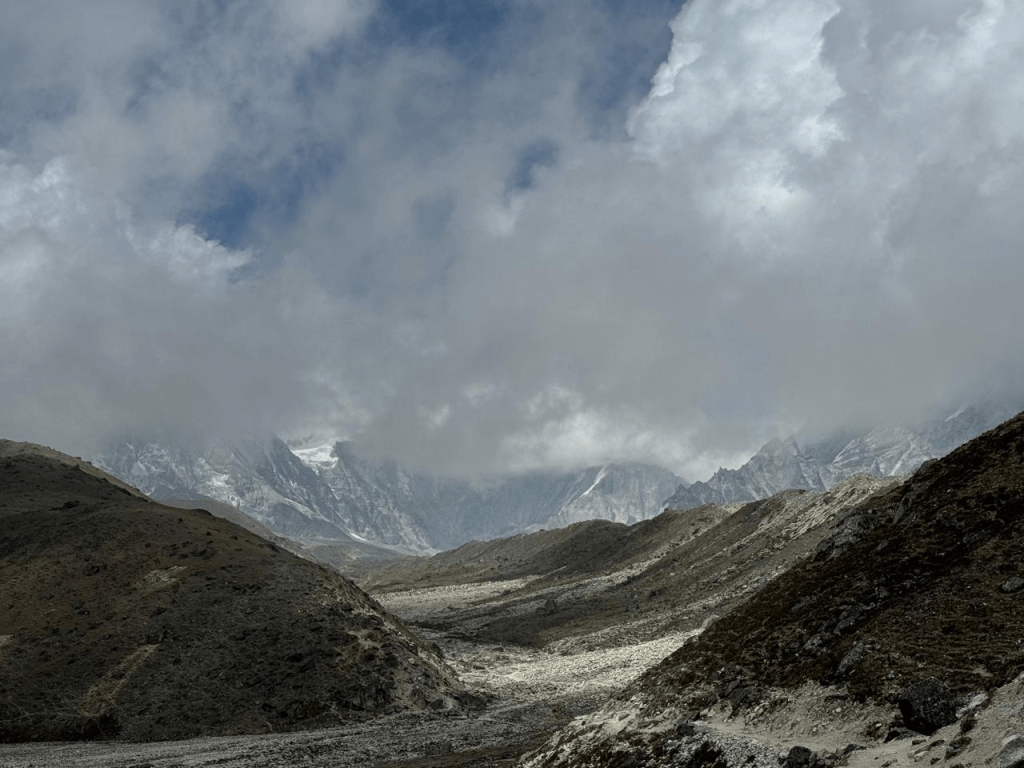 The trail beyond Thukla Pass was relatively flat, a relief after the steep climb we had just conquered. The landscape had changed dramatically – we were now in a land of giant mountains, large plains, and rocky paths. The lush greenery of the lower valleys was long gone, replaced by dry, dusty terrain that stretched out before us. There was no vegetation, no signs of life except for the trekkers and the occasional yak caravan making its way up the trail. As we continued on, I found myself marvelling at the vastness of the landscape. The mountains seemed even larger now, towering over us like ancient guardians watching our every step. The path was less defined, and at times it felt as though we were walking through a world untouched by time. There was a wild, untamed beauty to it all – a sense that we were truly in the heart of the Himalayas, far from civilization and everything that was familiar.