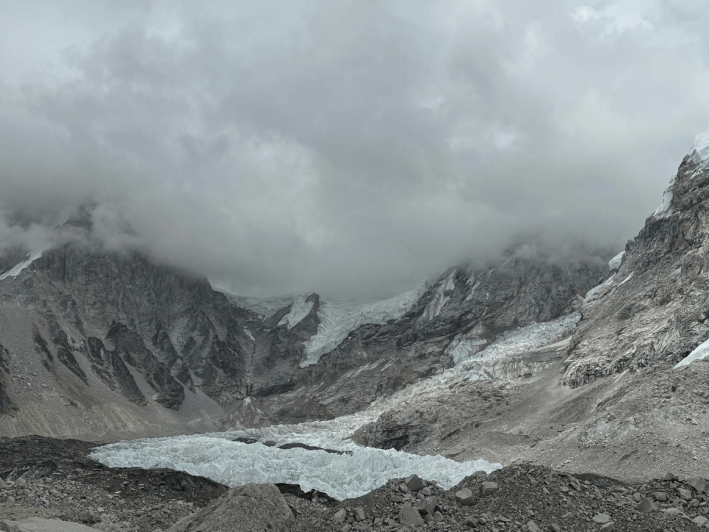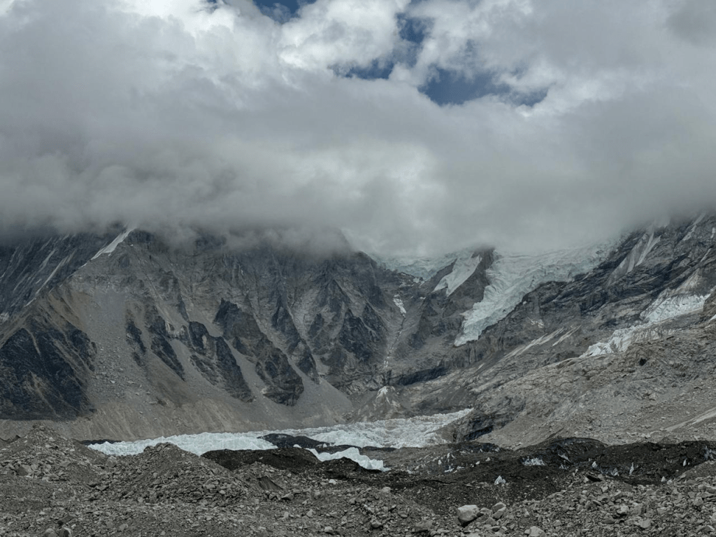 The fear and excitement were inseparable, intertwined in that moment. Each groan of the glacier was a reminder of the stakes, but also of the extraordinary journey we were on. It was terrifying, yes, but it was also awe-inspiring, a test of endurance, courage, and faith in every step. The danger was real, but so was the unshakeable drive to keep going, to push past the fear and reach something beyond myself. The weather had turned against us, as if the mountains were testing our endurance one final time. What had begun as a challenging trek was now a battle against the elements themselves. The sky, which had been clear and bright in the early hours, was now swallowed by a heavy blanket of clouds playing hide and seek. A biting cold wind whipped relentlessly against our faces, cutting through every layer of clothing. It wasn’t just the high altitude that made breathing a struggle anymore—the wind seemed determined to steal the very air from our lungs, leaving us gasping for breath in the thin icy air.