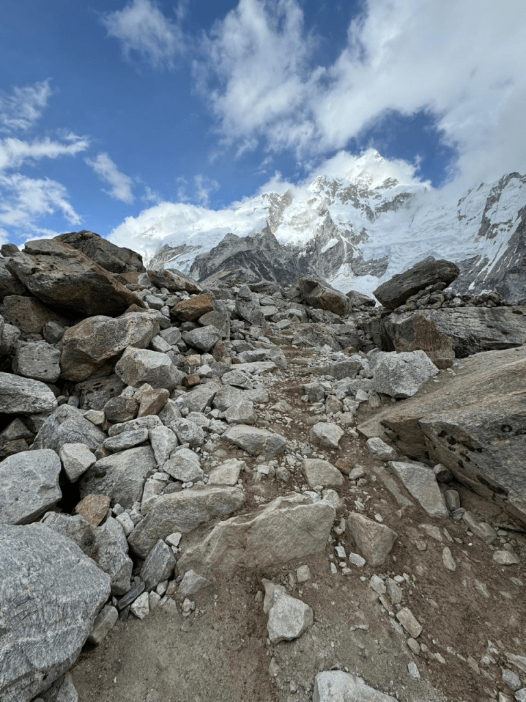 With each step forward, I had to focus with laser precision, my mind completely in the present. It was not enough to simply place one foot in front of the other—each movement had to be calculated, deliberate. The trail demanded respect, and it made sure we knew that a single misstep could lead to serious consequences. The rocks seemed to shift and slide underfoot, adding an extra layer of attention, as though the mountain was testing not just our physical strength, but our mental endurance too. One wrong step, and the ground beneath could easily crumble, plunging us into the jagged depths of the glacier.